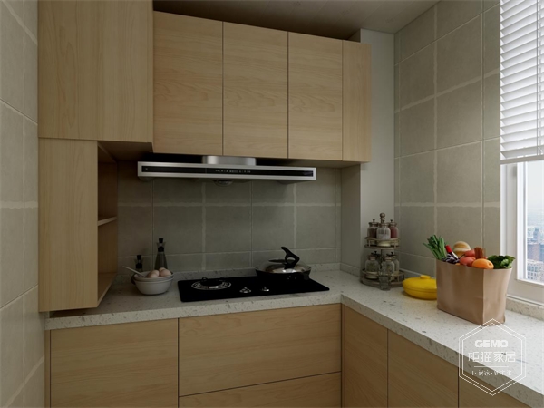 廚房:這一戶(hù)型的廚房空間不是很大,設(shè)計(jì)師根據(jù)實(shí)際,將L型植入廚房,洗、切、烹調(diào)依次進(jìn)行,生活的安心在此被打開(kāi),地柜與吊柜的組合,將空間藝術(shù)展現(xiàn)的淋漓盡致。暖色調(diào)的柜體搭配白色臺(tái)面,總能讓烹調(diào)者的心情更美好。
