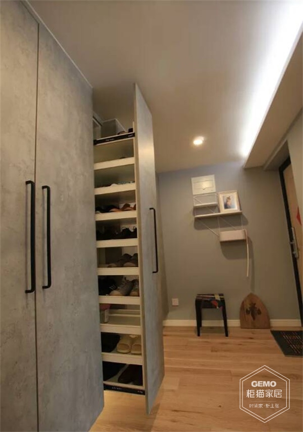 遠處露出一角的是入戶門,快遞在門口只能看到玄關(guān)鞋柜,保證了客廳私密性。