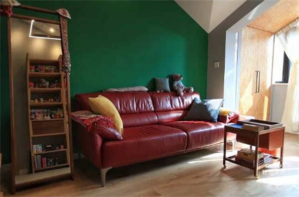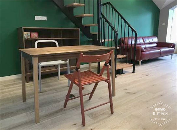 客廳被樓梯分成就餐和休閑倆個區(qū)域,主體顏色是紅(沙發(fā))配綠(墻)。因為家里大多數(shù)家具都是紅橡木拼黑胡桃,所以樓梯也選用了紅橡木涂清漆。沙發(fā)與樓梯之前的小空間放了一面大穿衣鏡,斜放顯腿長。