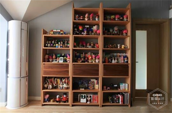 “書房”其實就是客廳沙發(fā)對面的墻,沒有電視也沒有投影,只有滿滿一墻各類書籍玩具紀念品,繼續(xù)發(fā)放儲物。