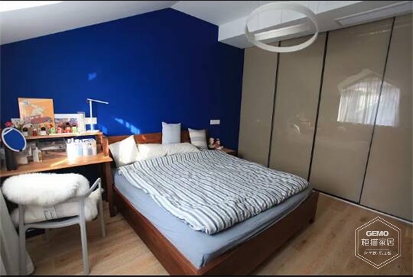 門口視角的臥室全景,木墨床、左側(cè)梳妝臺、右側(cè)床頭柜,都是木墨紅橡木拼黑胡桃的。為了安裝風(fēng)管機做了部分吊頂,同時留了部分平臺安裝吊燈。為了整體感和開門不擋衣柜,臥室門采用日門折疊門設(shè)計。