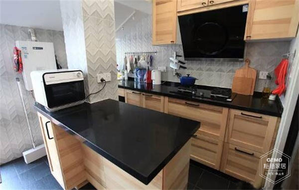 白蠟?zāi)緳还?黑色臺面,瓷磚花紋再次體現(xiàn)了完全不考慮打掃難度的決心。中間的承重柱將廚房分成三個區(qū)域,因地制宜做了一個可操作臺可就餐區(qū)的中島。