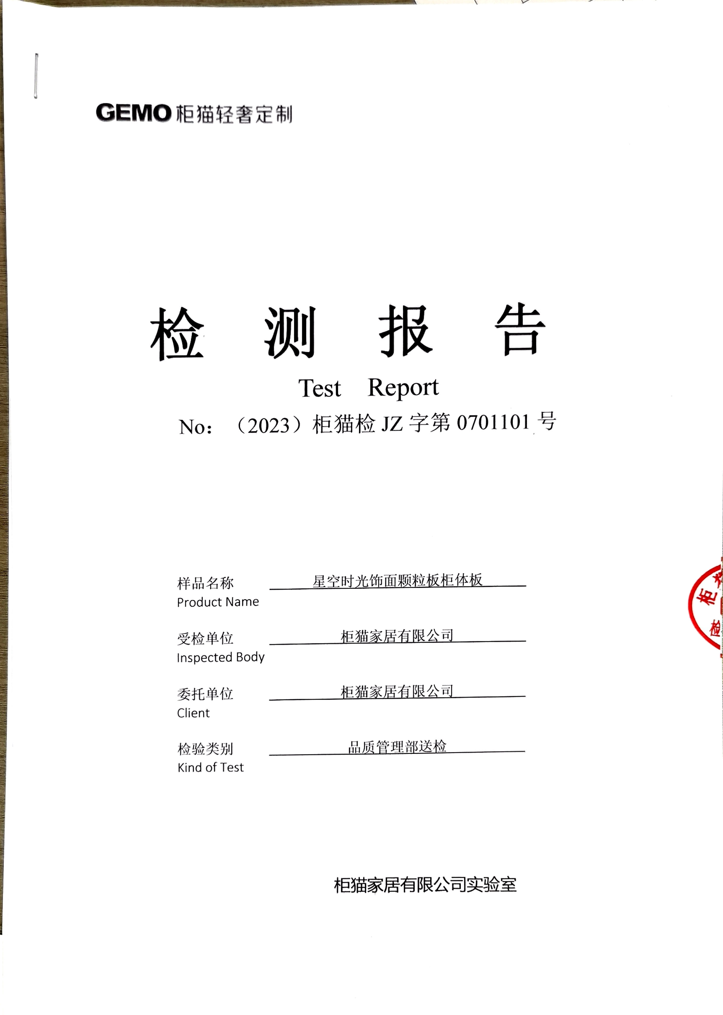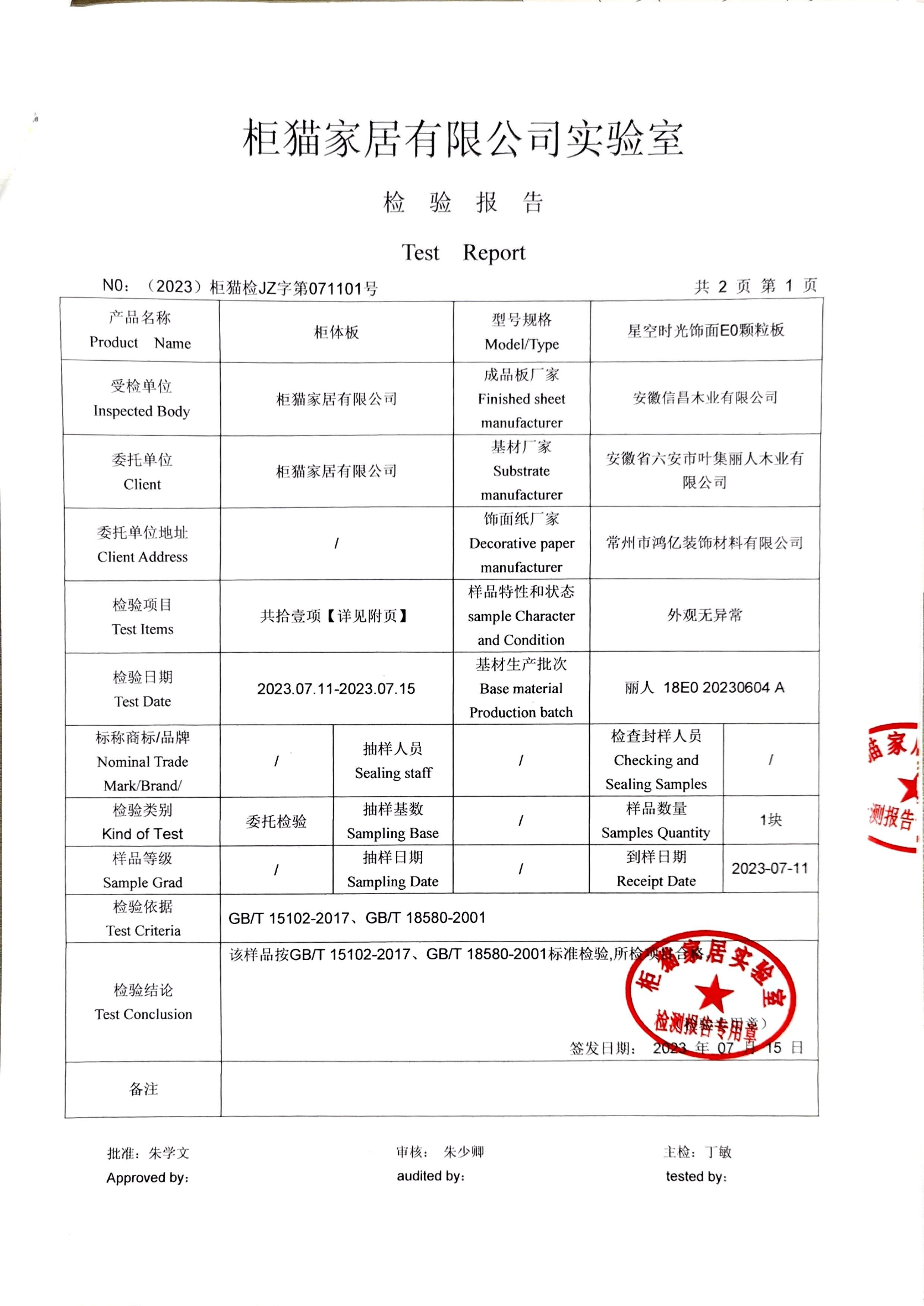 柜貓輕奢定制2023年7月星空時光飾面顆粒板柜體板實驗室檢測報告