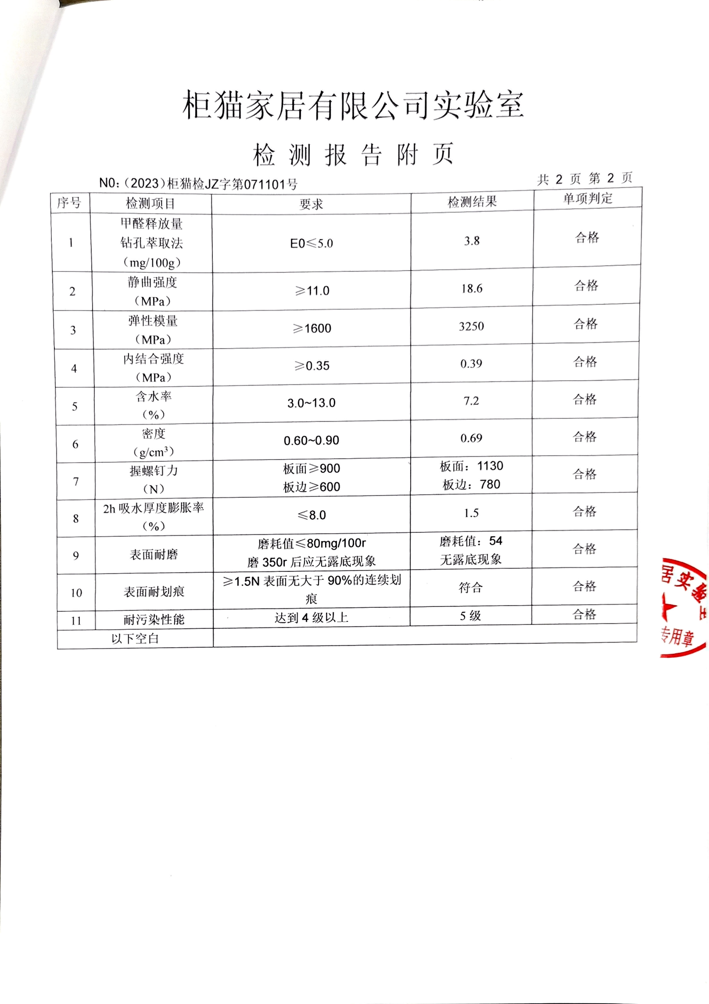 柜貓輕奢定制 2023年5月卡特灰飾面顆粒板柜體板實驗室檢測報告