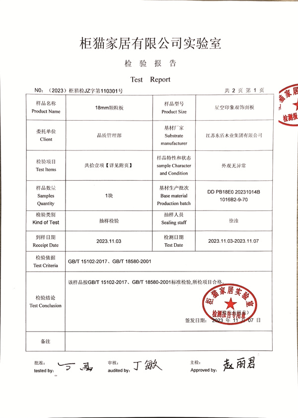 柜貓輕奢定制2023年7月星空時(shí)光飾面顆粒板柜體板實(shí)驗(yàn)室檢測報(bào)告